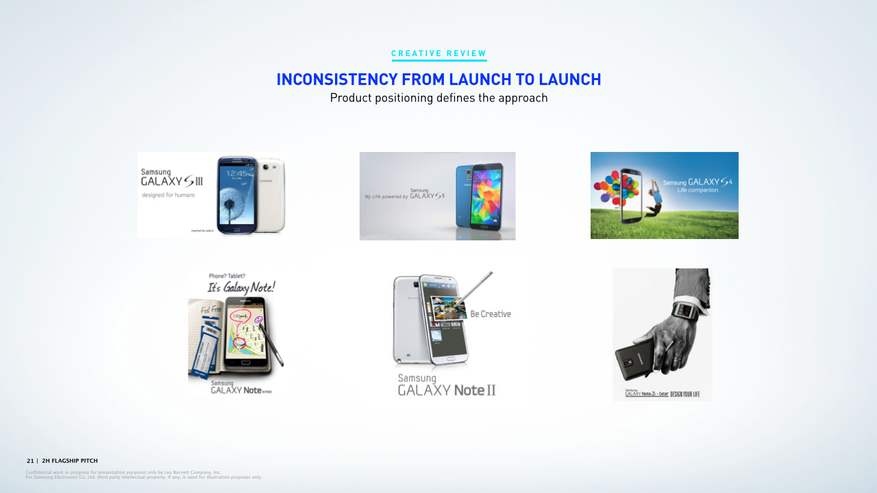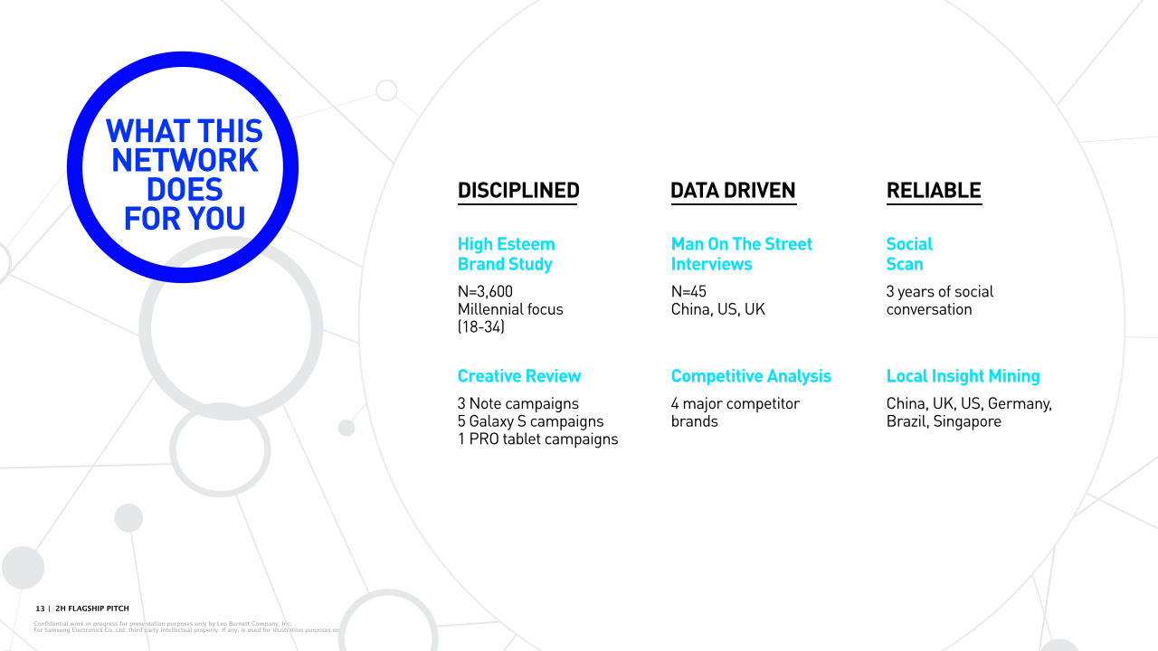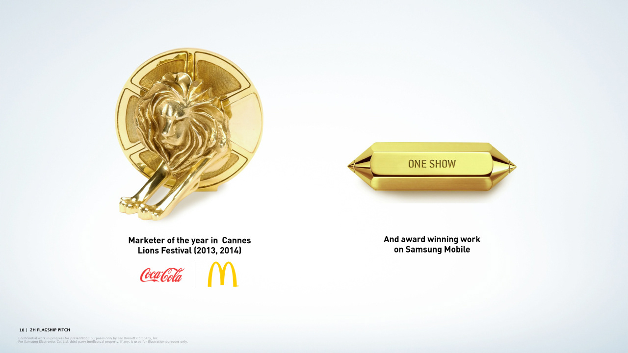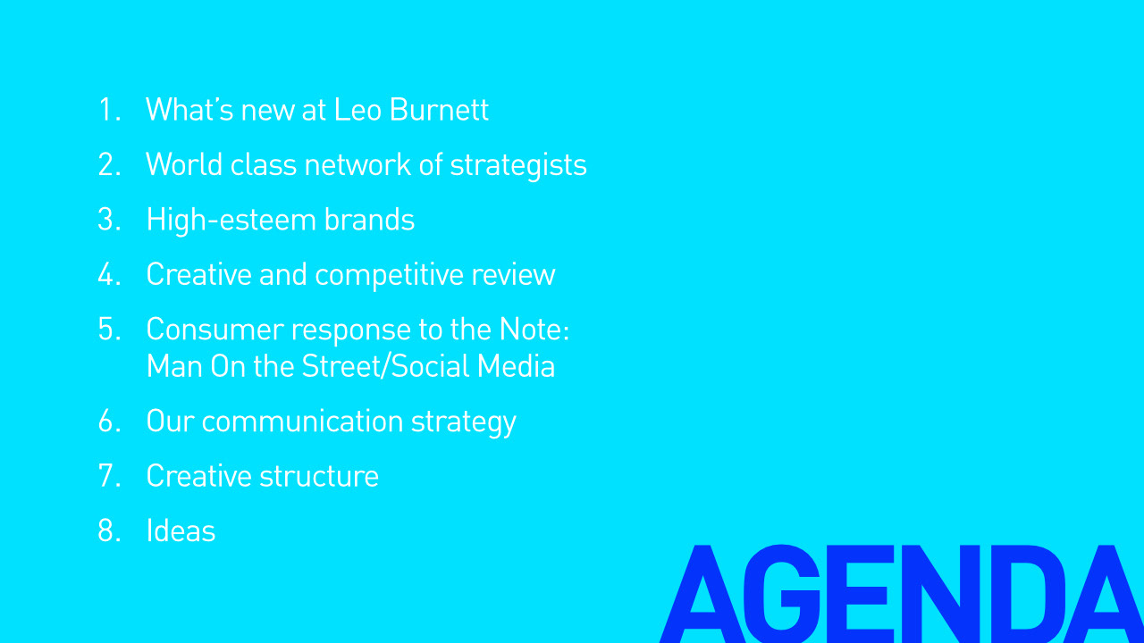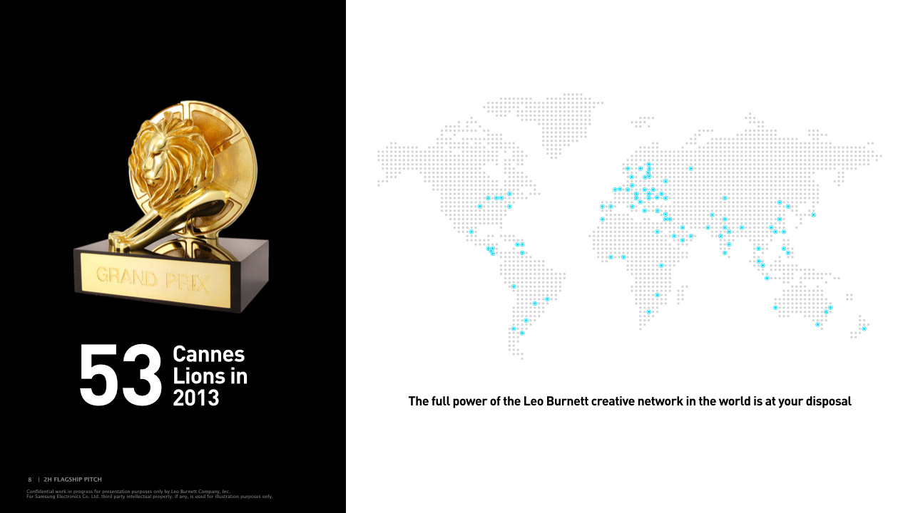 Presentation deck page examples for Leo Burnett.